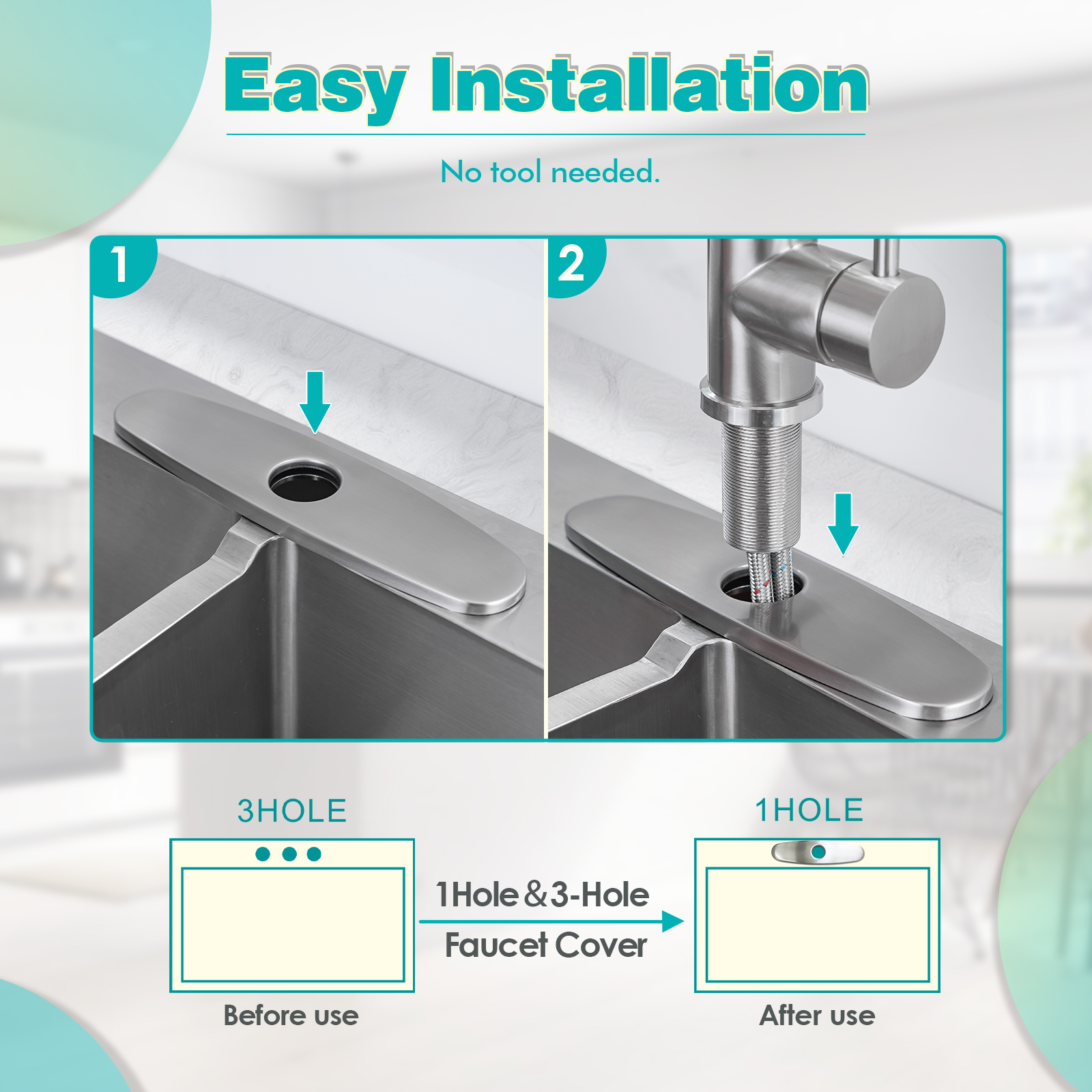 Easy Installation: You just need to put the deck plate for kitchen faucet onto the sink hole before faucet installation, then let all the hoses pass through the center hole of the escutcheon, no any tool needed. It can be installed in 1, 2 or 3 hole sink.