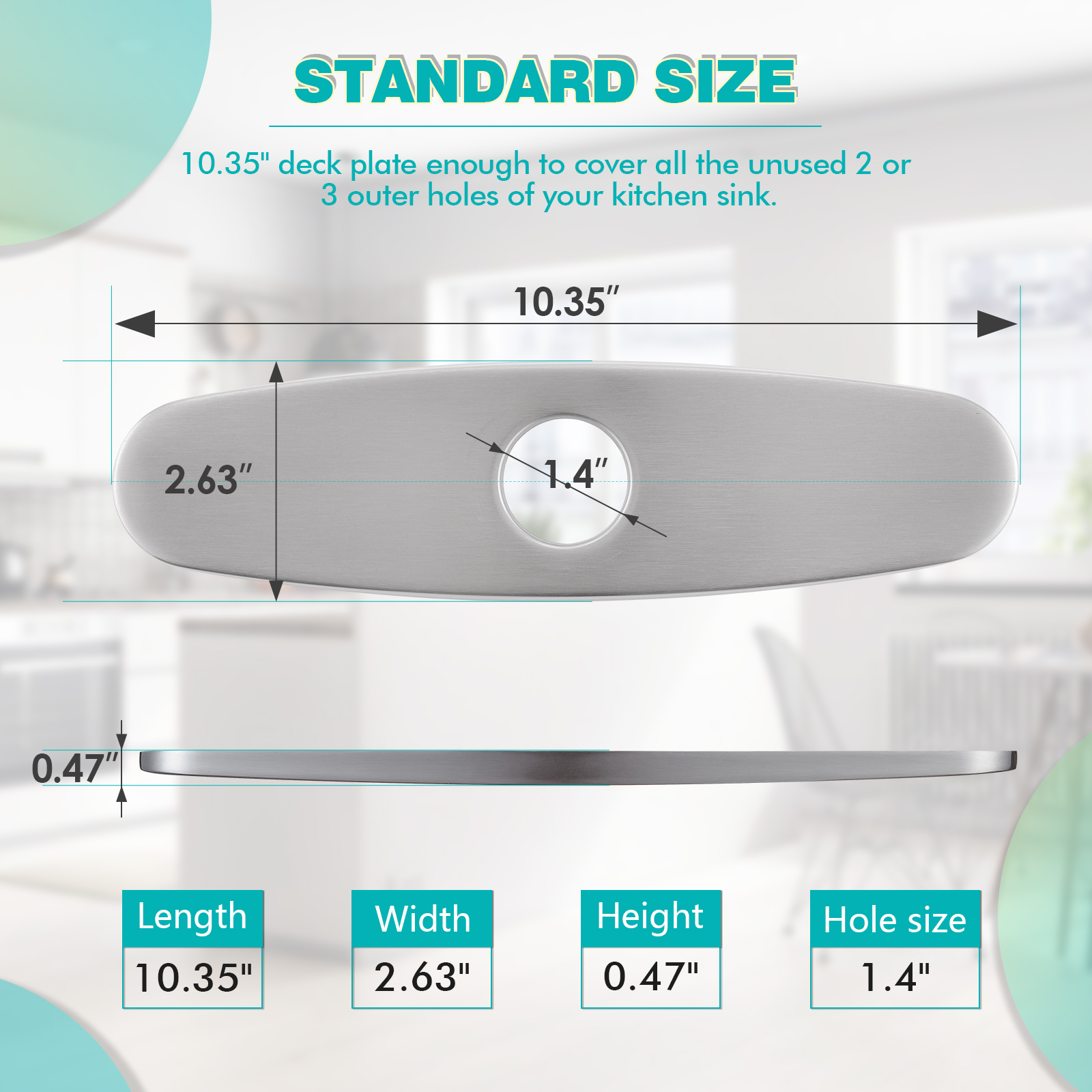 Standard Size: The length of Faucet Plates to Cover Holes is 10.35”, longer than the normal size 10” to meet different needs. Width:2.63”, hole diameter: 1.4”, it can perfectly cover the unused outer holes of the sink.